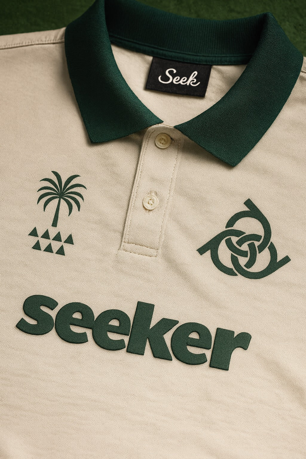 Main “seeker” logo: Premium PUFF print, giving a raised 3D tactile texture.