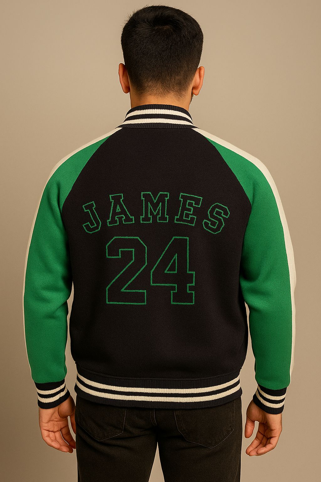 Capture an ultra-realistic 8K studio photograph of a Pakistani handsome clean-shaven male model wearing a premium knitted varsity jacket in two colorways exactly like the reference images. The photos should look editorial-style, crisp, and high-end.