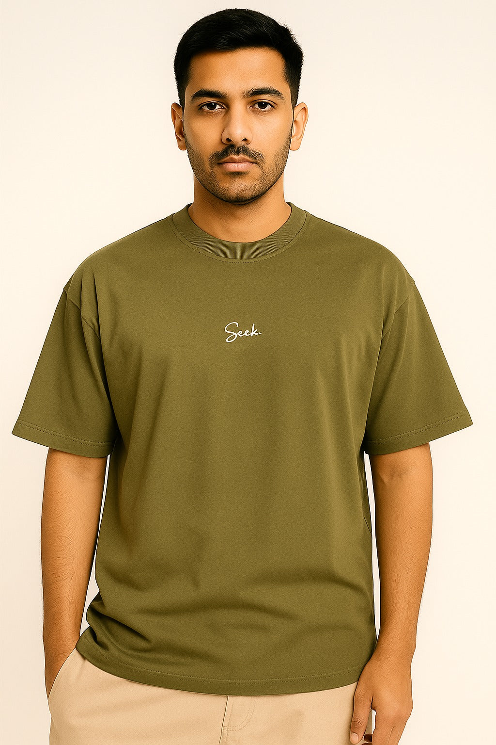 • Minimal embroidered “Seek” signature on chest — centered and tonal in off-white/cream thread